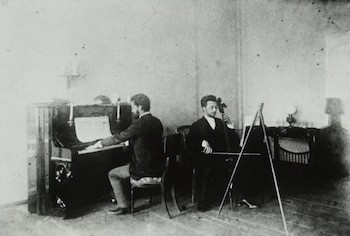 Kandinsky tocando el violonchelo mientras su amigo toca el piano, hacia 1886